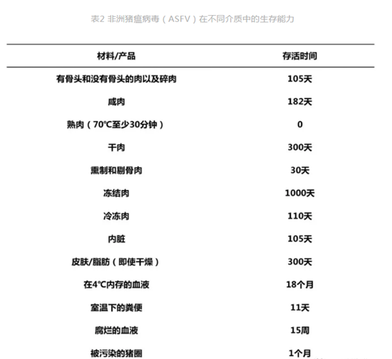 非洲猪瘟病毒属有囊膜的DNA病毒,它不感染人,不会对公共卫生造成直接危害(EFSA,2009)。非洲猪瘟病毒有很强的体外生存能力,病毒存活能力强,在冻肉中可以存活数年到数十年,在未熟肉品,腌肉,泔水中也可长时间存活。病毒在60℃30分钟或56℃70分钟可被灭活。病毒在pH<3.9或>11.5无血清介质时可被灭活;血清增加,抵抗力增加,比如:在pH13.4时,无血清时可存活长达21小时,有血清时可存活7天。