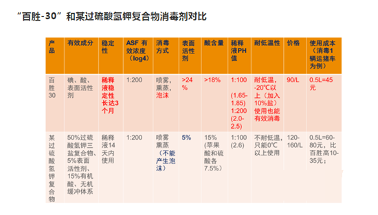 “百胜-30”含有约3%的有效碘,24%以上的表面活性剂(具有很强的渗透能力,提高消毒效果)、18%以上的酸(使消毒环境成酸性并且不受水质影响)。高含量的表面活性剂和酸可以大幅度提高百胜的杀菌能力。