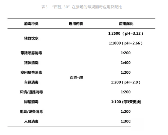 “百胜-30”消毒液在猪场应用于喷雾、饮水、浸泡和擦洗消毒等方式,常规消毒种类及配比见下表(表3)。