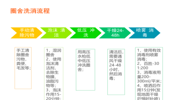 同时注意定期清洁和消毒所有农场工具,以防止交叉污染。消毒时可以用1:200倍稀释的“百胜-30”。