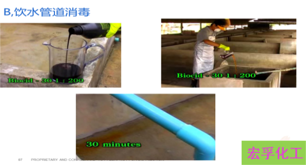 2)管道消毒。生物膜去除后,用1:200倍稀释的百胜注入管道,作用30分钟消毒饮水系统。再用清水冲洗。